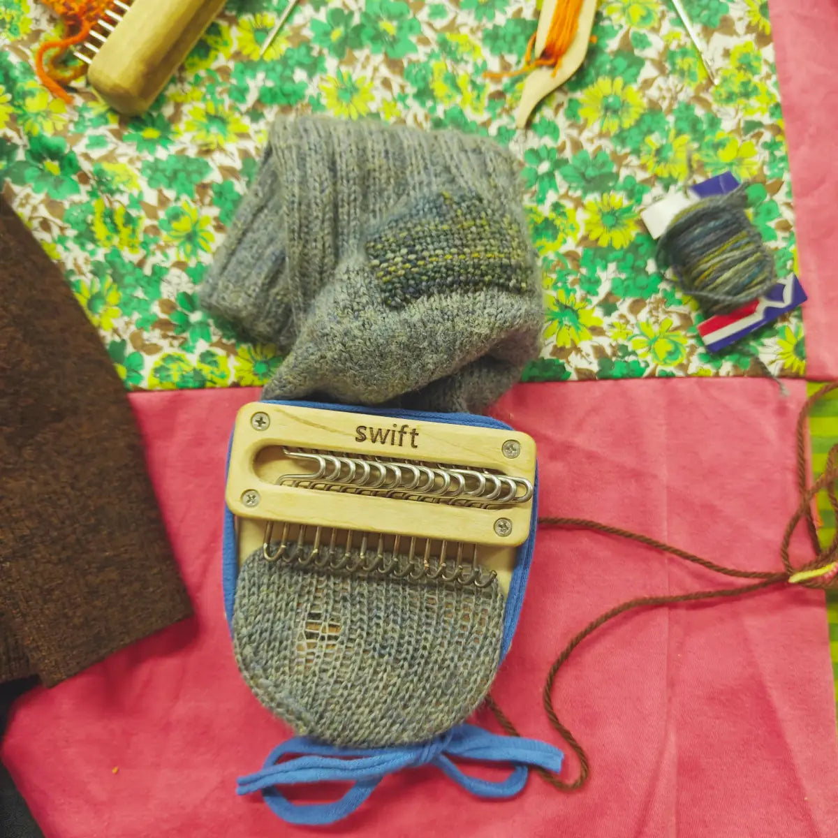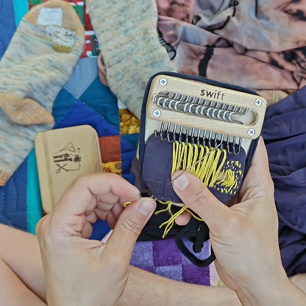 The Swift Darning Loom comes with a very generous work surface (dimensions approximately 3" x 4.5"), but we've found that in some cases this is TOO BIG! So, we dug through our scrap bin to create an option that's perfect for small socks and other hard-to-reach areas you need to patch.