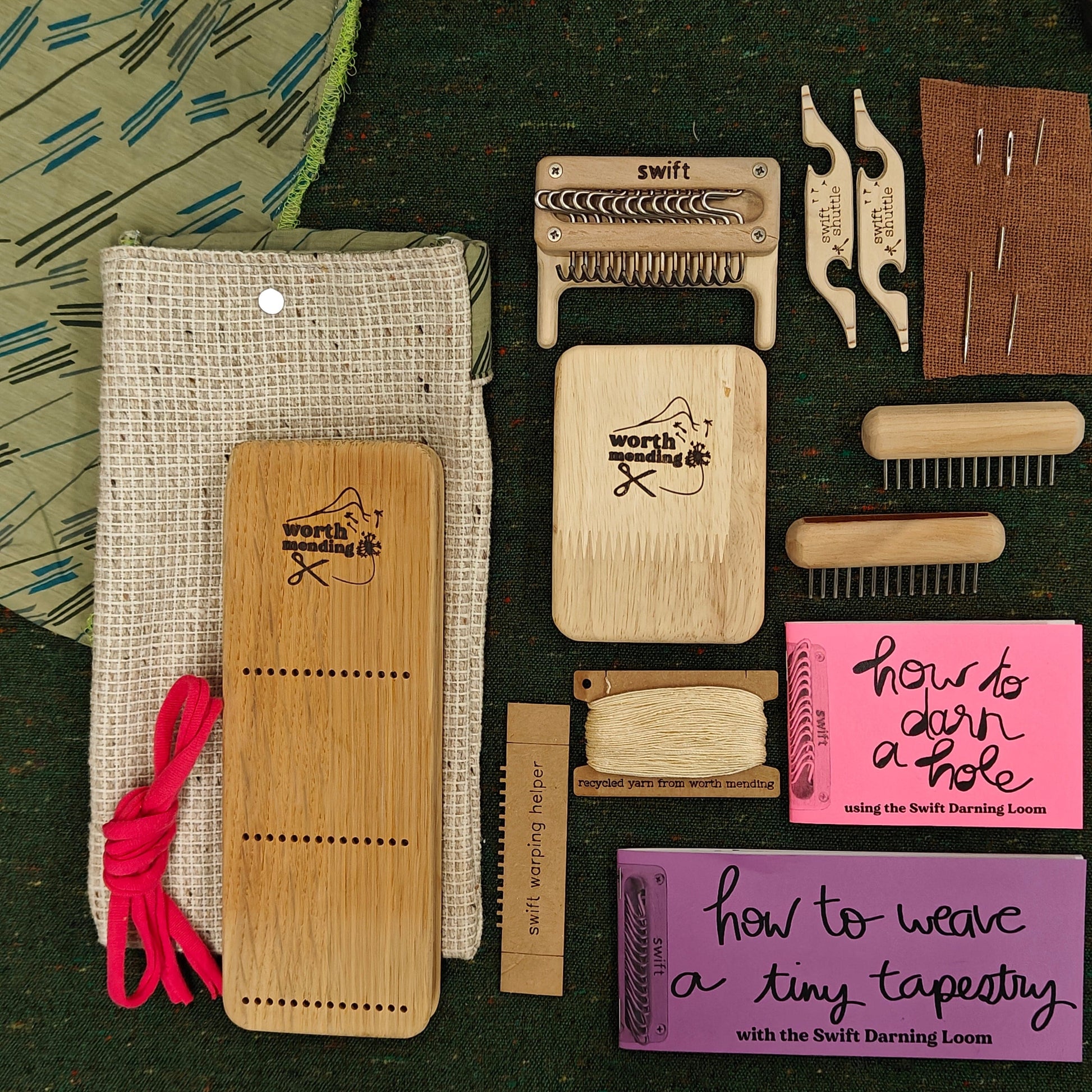 This ultimate bundle includes you need to master the Swift Darning Loom for darning AND weaving. We've also included some cotton yarn for warping your weaving loom, so you can dive right in adding in any colours and textures of yarn from your own stash for the actual weaving.